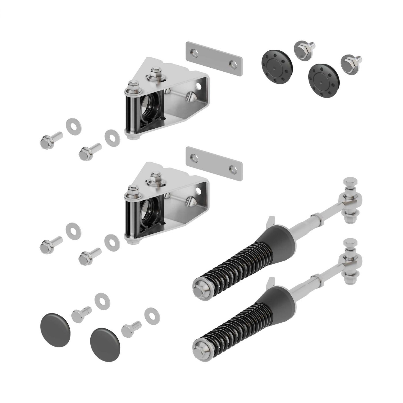 Innehåller 2 fästen, 2 stabiliseringsstänger, 2 plattor, 4 hjulnav, 8 bultar och 6 brickor för en komplett installation.