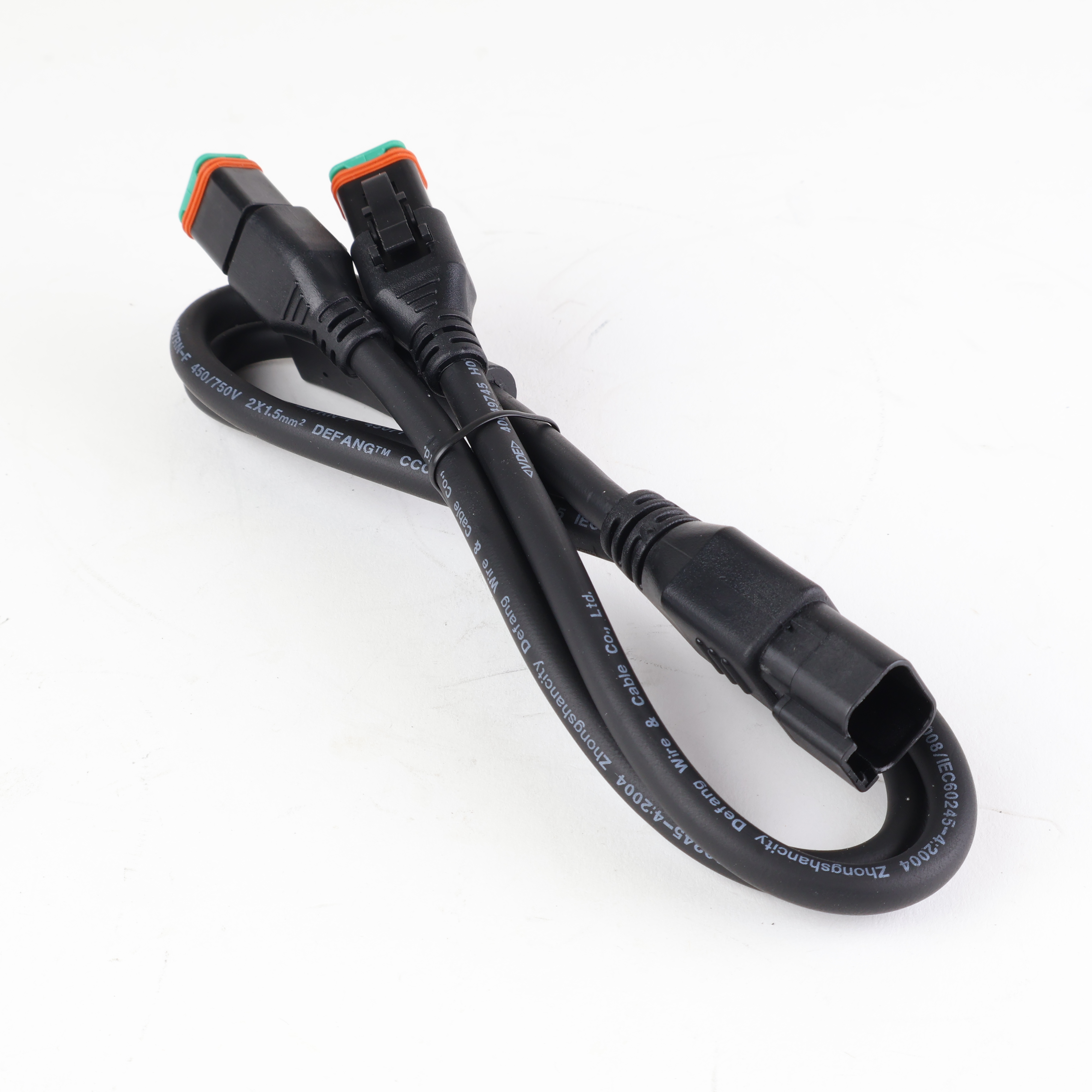 Praktisk och slitstark förgreningskabel med en monterad Deutsch (DT) kontakt hane som delas upp till två monterade Deutsch (DT) kontakter hona. Perfekt när du vill ansluta två LED-lampor till ett kablage med singelkontakt.