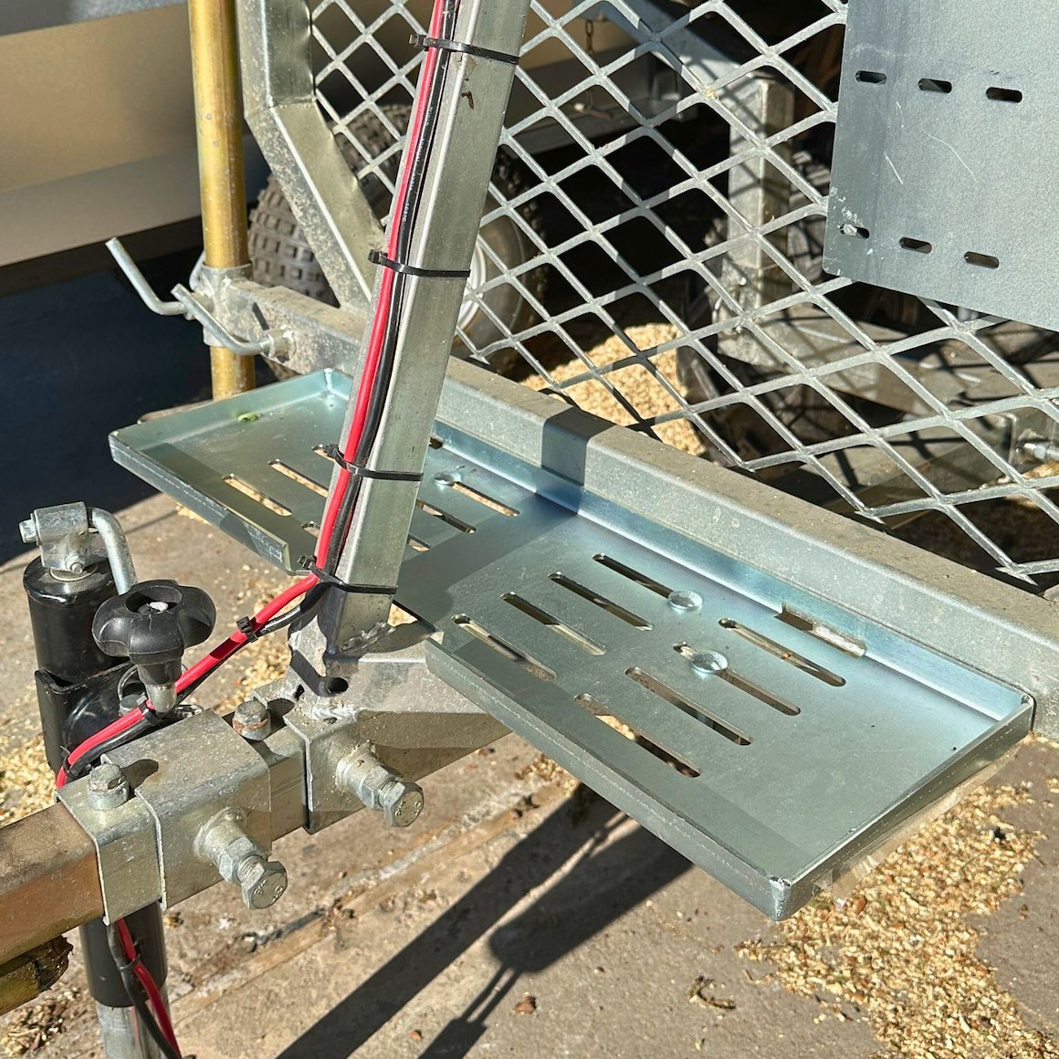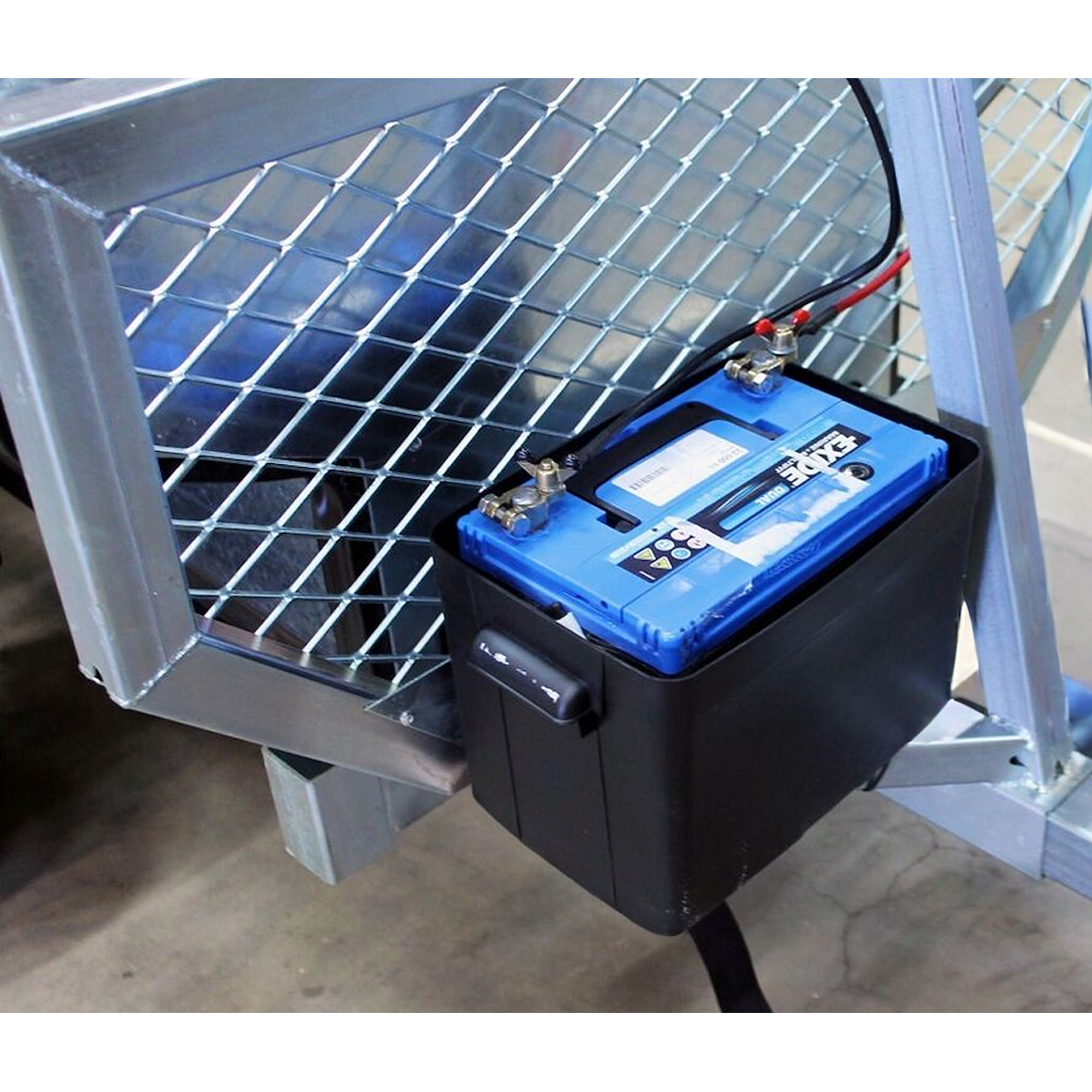 Vagnen kommer med ett fritidsbatteri som placeras på den medföljandebatterihyllan, vinschen kopplas till batteriet med batteripolskor viakablaget med snabbkontakter. Batteriet kan sedan enkelt kopplas ifrån omdet behöver laddas eller förvaras skiljt från vagnen.