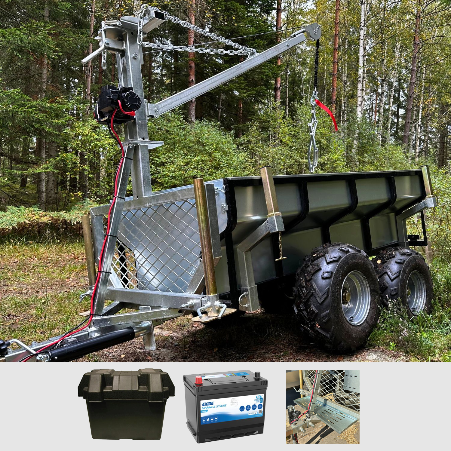 Vinschen som ingår är en kraftig 3500LBS/1588KG vinsch med stålvajer och fjärrstyrning vilket underlättar vid arbete i skogen då du kan stå vid stocken som skall vinschas in en bit från vagnen och se till att den inte släpper samtidigt som du vinschar in.