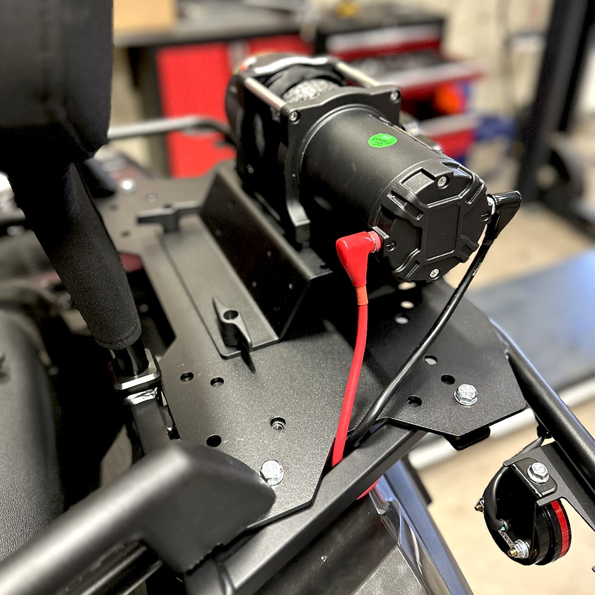 På bilderna är vinschfästet monterat på en Goes Terrox 500. För att passagerarhandtagen ska passa krävs att vinschplattans hål borras upp vid passagerarhandtagens infästning och att en längre bult införskaffas.