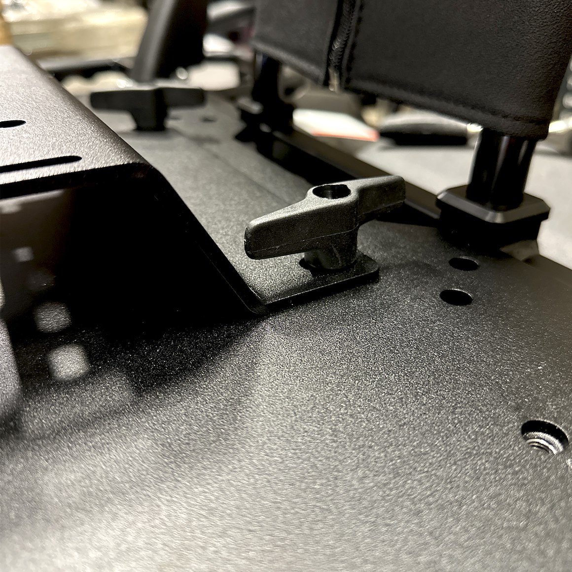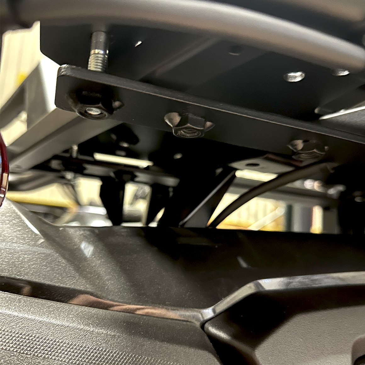 Monteringsplattan fästs i lastracket med de medföljande stagen och bultarna. Hålbilden är anpassad för de flesta stålrack, vilket gör installationen enkel och stabil.